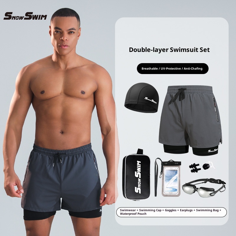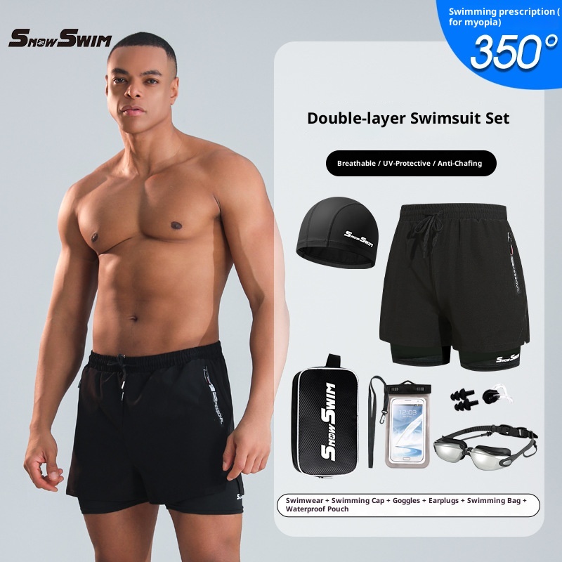001 001 Herren Doppellagige Badehose, schnelltrocknend, Anti-Peinlichkeits-Badehose, Strandshorts, Badebekleidung für heiße Quellen, Set