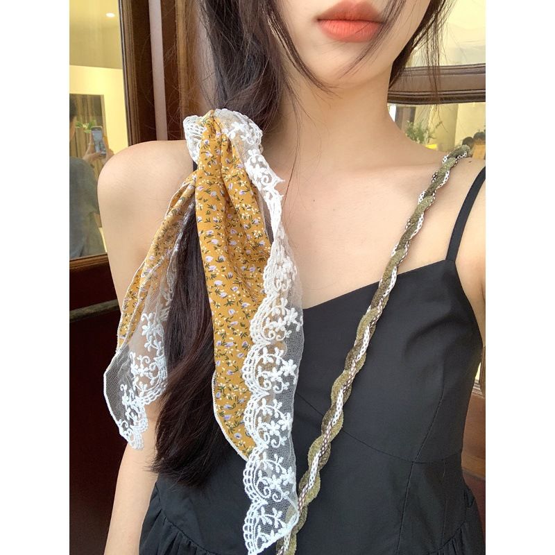 2024 new floral tied hair scarf with high-end feel, shawl, lace and lace patchwork headband, silk scarf for women