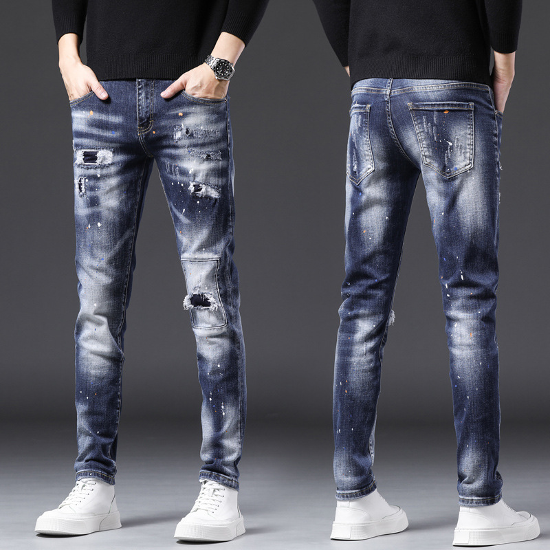 22 New Men's Wear Broken Hole Tie Cloth Hip Hop Street Ruffian Handsome Male Small Straight Barrel Wild Heavy Duty Jeans Male
