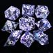 This DND dice set is named "Nocturne Violet Dice", where every roll bleeds twilight secrets into reality. When your shadow sorcerer manipulates the fraying edges of existence or your whispers bard channels forbidden nocturnes, these dice don't settle—they dissipate like dying echoes, their glass-clear cores corrupted by creeping amethyst shadows while bone-white fractures spiderweb through the numbers. That breathless pause before revelation? The Nightmother holding your fate between her talons.
