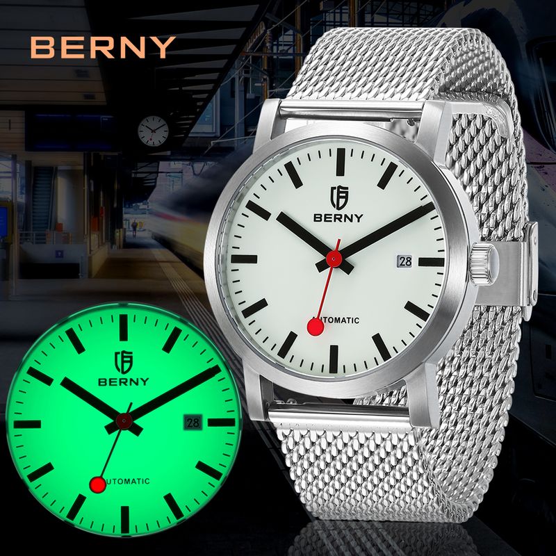 BERNY Automatikuhren für Herren, minimalistisches Edelstahl-Mesh-Band, analoge mechanische Uhr mit Datum, 5 ATM wasserdicht, leuchtende Saphir-Armbanduhr