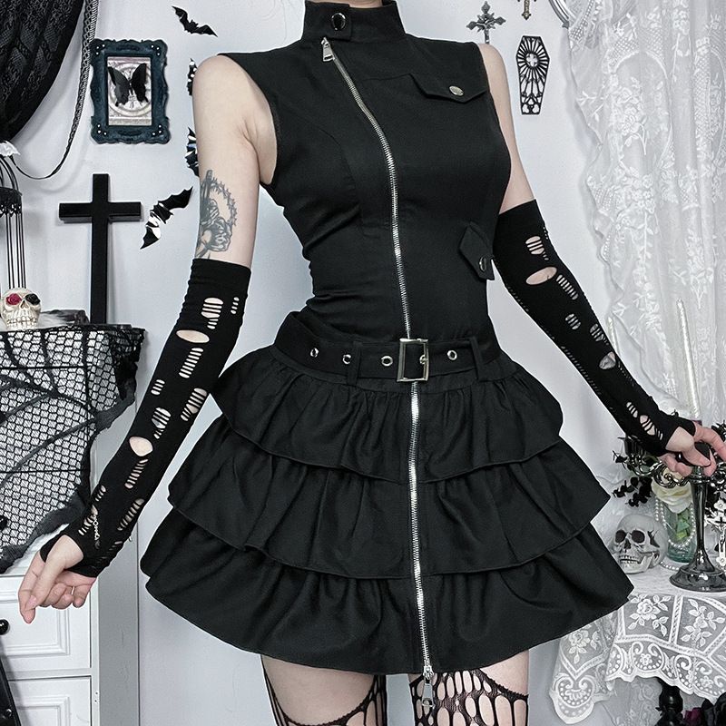 CF25043 Dark Gothic Style Zipper Weste 2025 Neue Persönlichkeit Street Punk Kleid Für Frauen