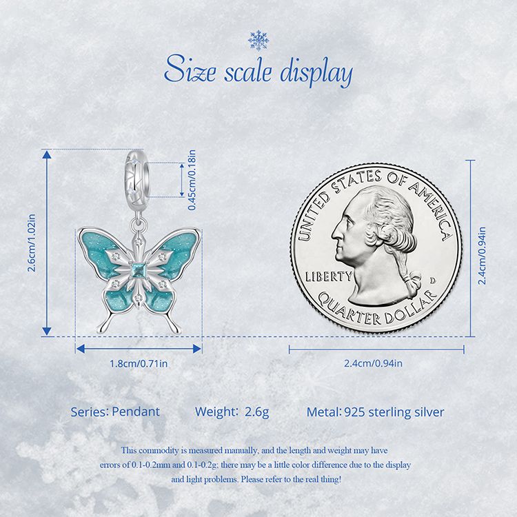 The design ofblue ice snowflake butterfly embracing a snowflake in the center symbolizes purity, beauty, and freedom.
