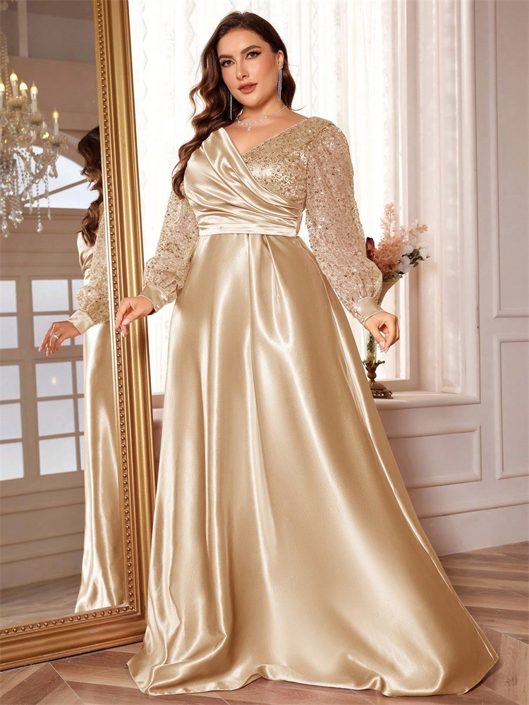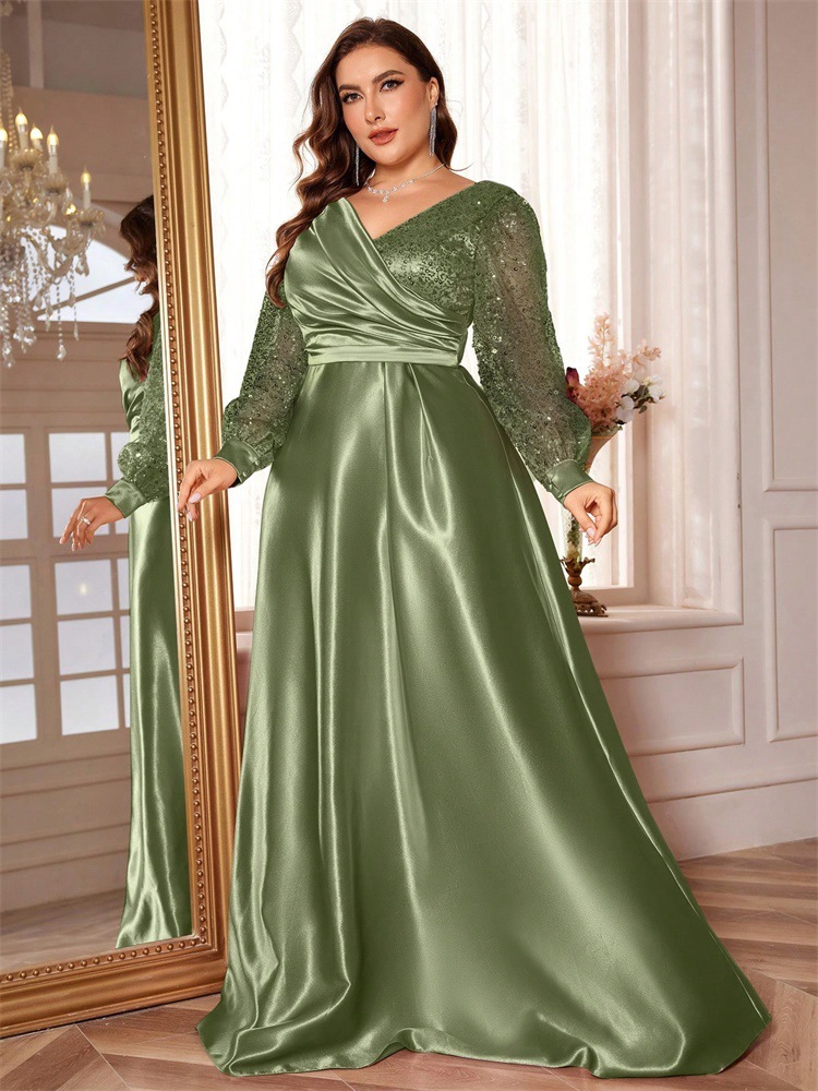 ChicShe Cross-Border Neues elegantes Plus-Size-Kleid aus Satin mit Pailletten, langen Ärmeln, V-Ausschnitt, schmal geschnitten, für Brautjungfern, Bankette und Abendveranstaltungen
