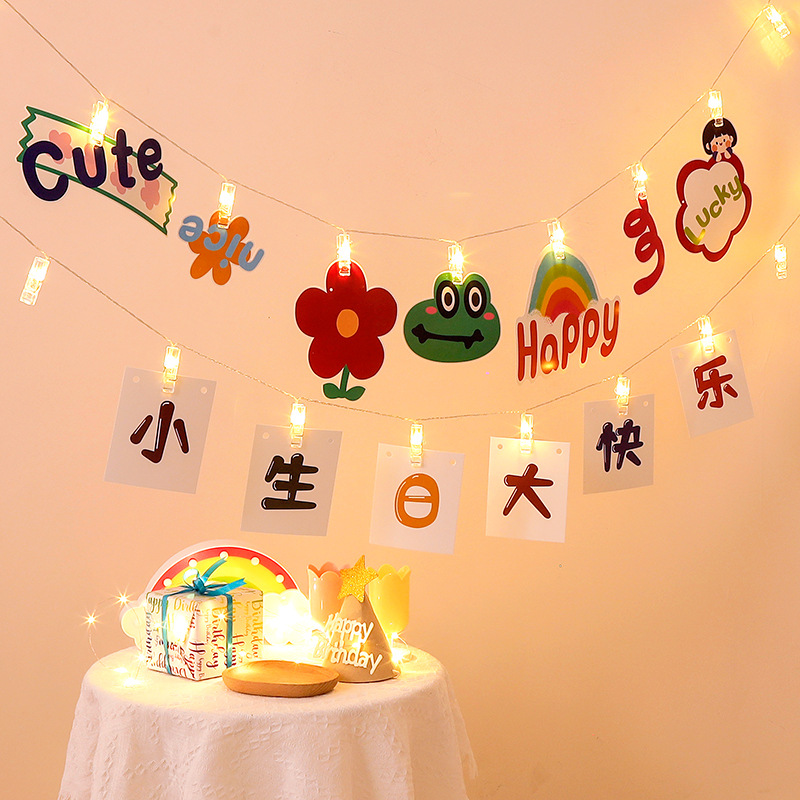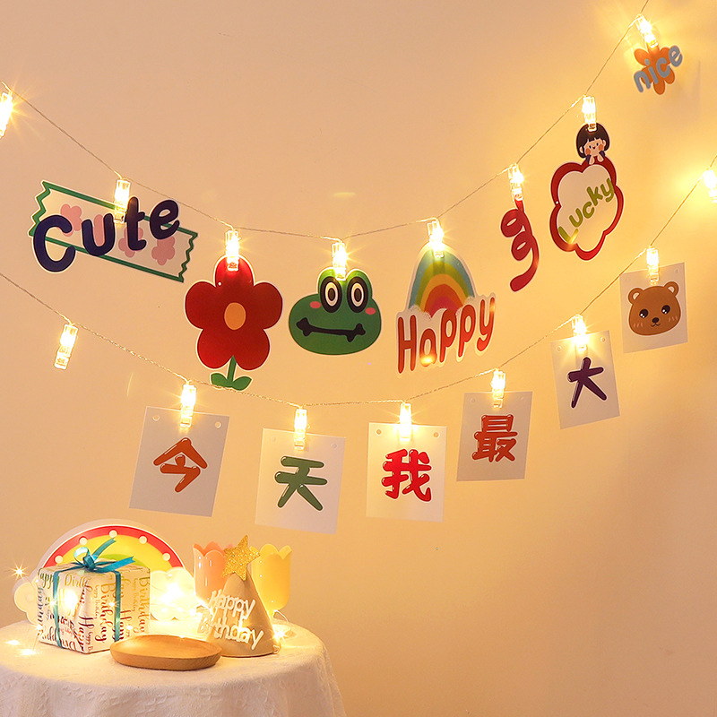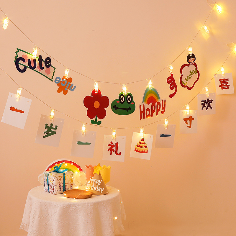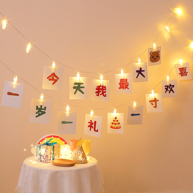 Dekorationen für den ersten Kindergeburtstag: Leuchtclips, Lichterketten, Hintergrundbanner, Überraschungsszene