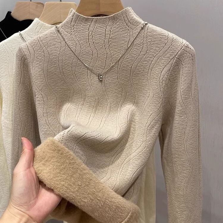 Damen-Fleece-gefütterter Strickpullover – Halbhoher Rollkragen, dickes Winter-Thermooberteil (Weiß, Schwarz, Beige, Khaki, Grau, Rot, Camel, Braun)
