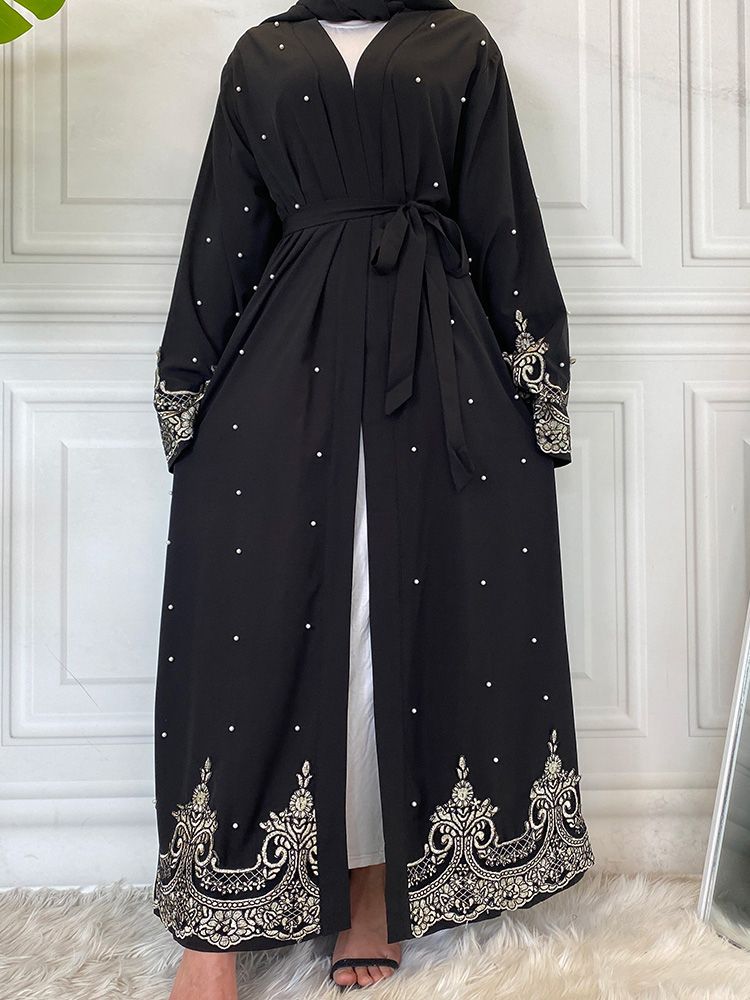 Heißer Verkauf Offene Abaya Frauen Kleidung Spitze Mit Perlen Design Muslimischen Mode Kimono Lange Kaftan Islamischen Dubai Kleider Für Frauen