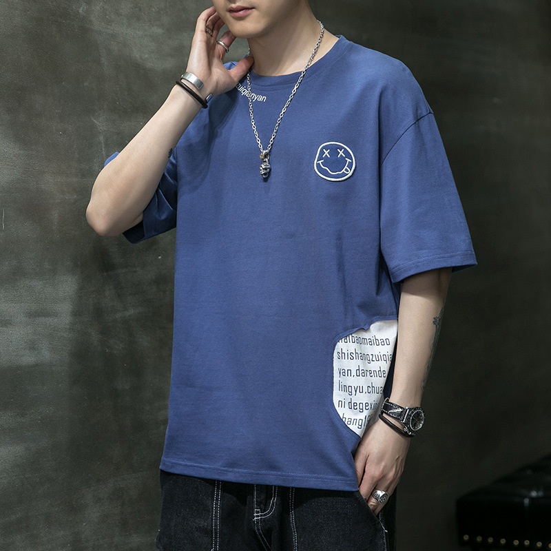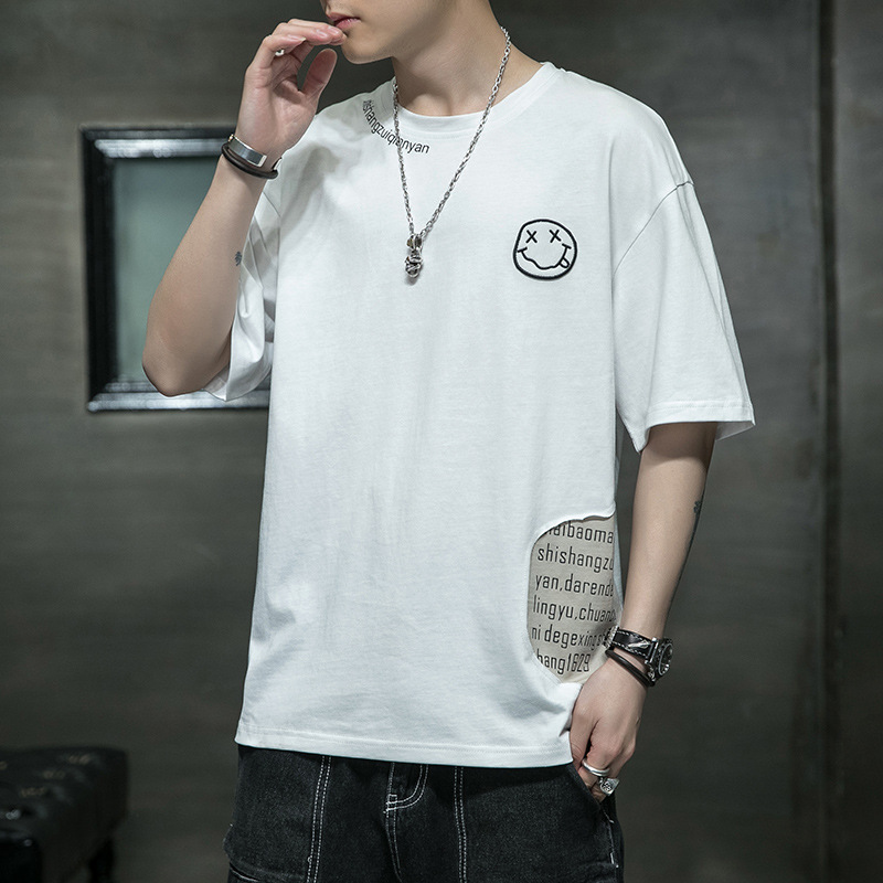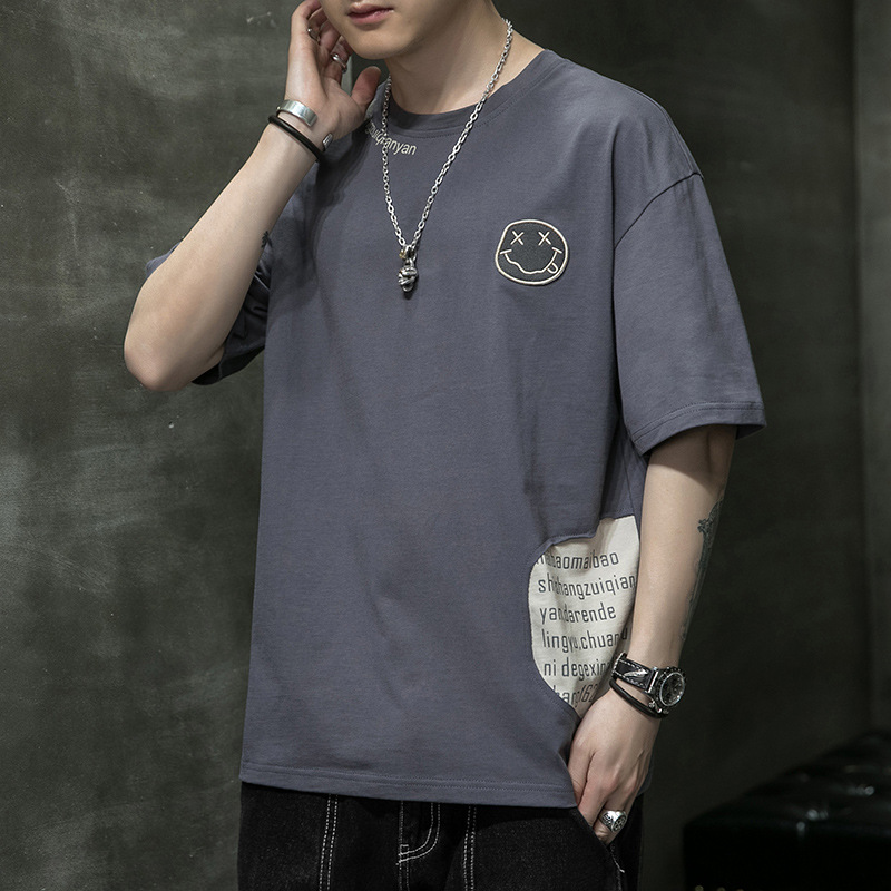 Kurzarm-T-Shirt mit besticktem Lächeln-Gesicht für den Sommermodetrend für Herren, Oberteil mit Kontrastfarbe, lockere Fünf