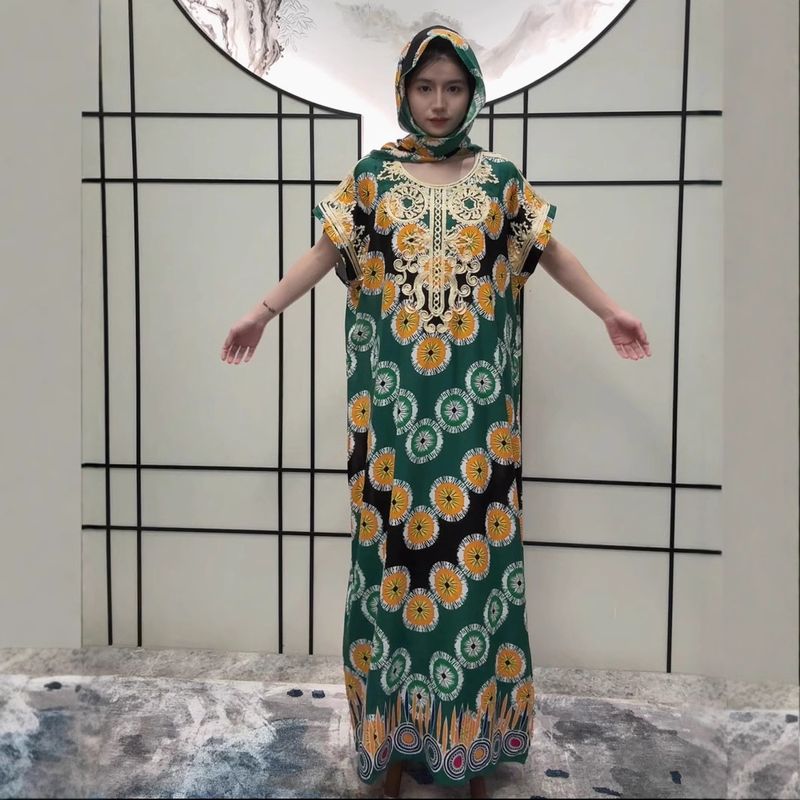 Langes Blumenkleid im Ethno-Stil 2025, neues besticktes, bedrucktes, lockeres Gewand mit Kopftuch, zweiteiliges Set