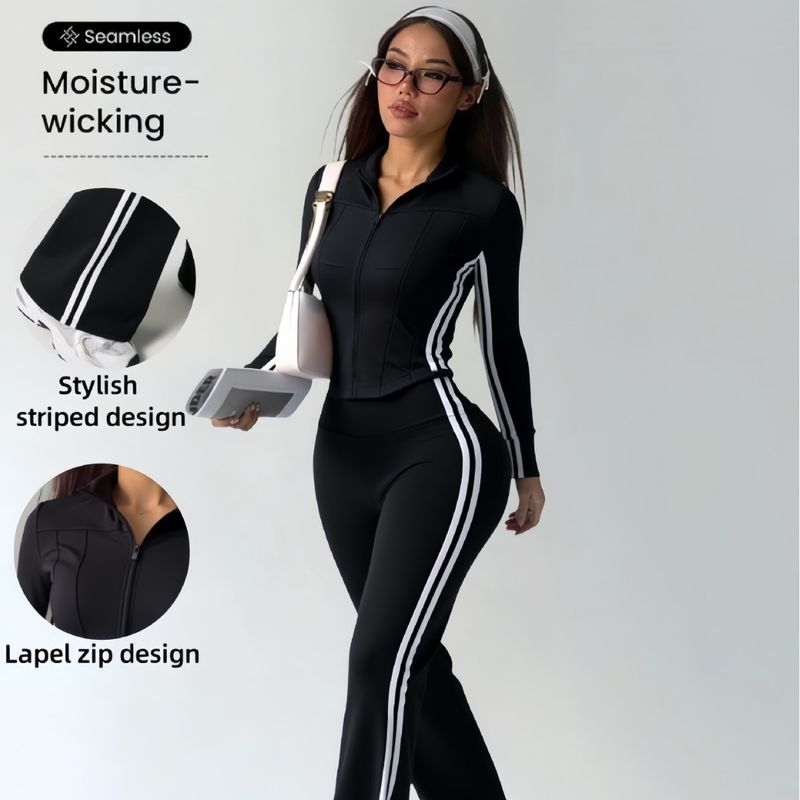 New Yoga Flared Pants Set for Women, Outdoor Sports Sun Protection Long Sleeve Jacket, Sports Casual Striped Pants