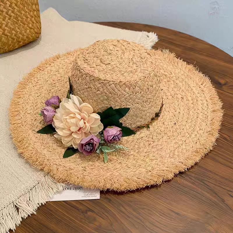 2025 New Raffia Straw Hat for Women Summer French Style Floral Beach Vacation Sun Hat with Wide Brim for Sun Protection