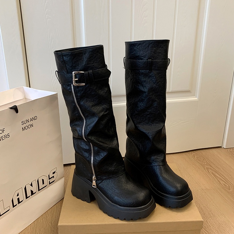 ShoeGlobe Damen-Reitstiefel im postapokalyptischen Stil mit dicker Sohle, runder Zehenpartie und langem Schaft, Xinjiang-Stil, neue schwarze, figurformende Sommer-Reitstiefel