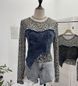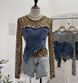 Damenbekleidung Real Shot Fashion Leopardenmuster Perspektive Hot Girl Mesh Splicing Denim Unregelmäßiges Bottoming Shirt Kurzes Top