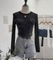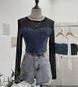 Damenbekleidung Zweiteiliges Denim-Spleißen-Netz-Langarmoberteil Kurzer, freiliegender Bauchnabel Schlankes T-Shirt