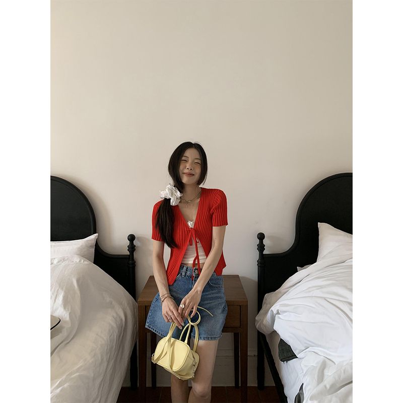 Yuyi New 2024 Summer INS Ribbed V-Neck Tie Knitted Sweater Women French Short Sleeve Cardigan Stretchy Top Women